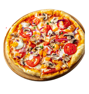 Tomate, mozzarella, pollo preparado con salsa especial, pimiento Rojo y Verde, cebolla, oliva Negra, orégano.